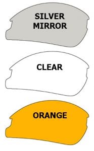 Black with Silver Mirrored, Clear, & Orange front lenses.